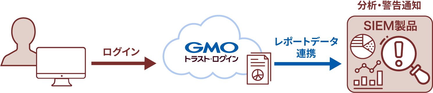 ご利用のSIEM(Security Information and Event Management)製品へGMOトラスト・ログインのレポートを連携し、 GMOトラスト・ログインへのログインやSSOによるアプリ量の履歴などのデータをSIEM製品上で表示・管理することが可能になります。